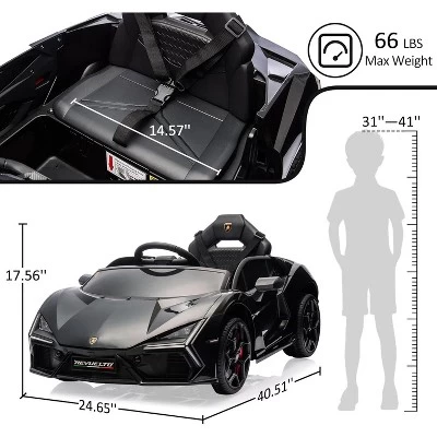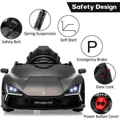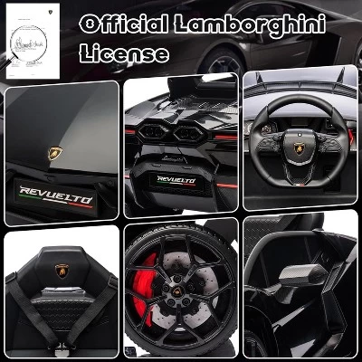 - 𝐋𝐢𝐜𝐞𝐧𝐬𝐞𝐝 𝐋𝐚𝐦𝐛𝐨𝐫𝐠𝐡𝐢𝐧𝐢 𝐑𝐞𝐯𝐮𝐞𝐥𝐭𝐨: Licensed by Lamborghini, the design of this kids ride on car is very realistic. With the official logos, console, steering wheel, and foot pedal, kids can enjoy a real driving experience.
