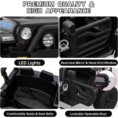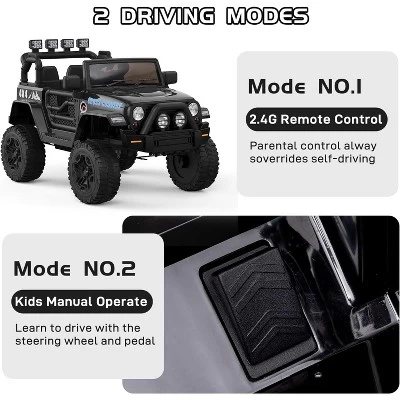 12V Kids Electric Ride-On Truck for Ages 3-6 with One-Button Start, Dual Doors, Adjustable Seat Belts, Lockable Doors, and Mesh Windshield for Realistic Driving Experience. Features Dual Driving Modes: Parent Remote Control and Child Manual Operation with Two Adjustable Speeds. Equipped with LED Lights, Spring Suspension, MP3 Player, AUX/USB/Bluetooth Audio, Horn, Soft Start Technology, Emergency Stop Button, and Durable PP Wheels for Smooth Rides on Various Terrains. Compact and Safe, Supports Up to 44 lbs, Perfect Gift for Toddlers.