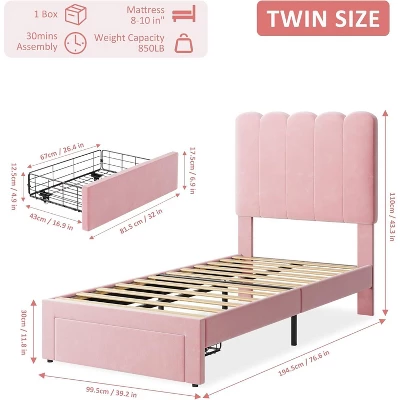 2 Sets Twin Bed Frame with Under-Bed Drawer, Boucle Upholstered Platform Bed with Wave Headboard, Wooden Slats Support, No Box Spring Needed, Pink