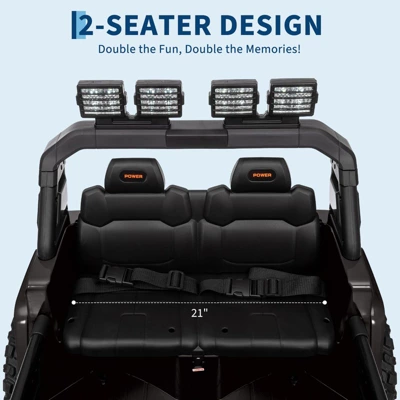 - Spacious Real 2-Seater with Safety Belts:Measuring 43.85″ x 31.49″ x 31.10″, this ride-on car features a true 2-seater design with a 20.5in-wide seat and separate safety belts. It comfortably fits two kids side by side, giving siblings or friends a safe and roomy ride they can enjoy together.