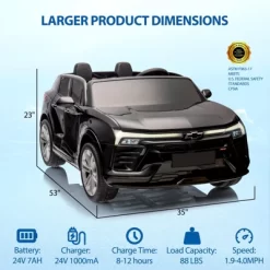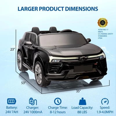 24V 2-Seater Kids Ride-On SUV, Licensed Chevrolet Blazer Electric Car with Parent Remote Control, Powered by 24V 7AH Battery for Up to 60 Minutes Playtime, Top Speed 4.0 MPH, Treaded Wheels for All-Terrain Grip, Safety Features Including Power Switch, Safety Belts, Soft Start, and Spring Suspension for Smooth Ride. Dual Control Modes: Child Pedal & Steering Wheel or Parent Remote (2.4GHz). Easy Assembly and User-Friendly Operation, Ideal for Kids to Share Driving Fun Safely.