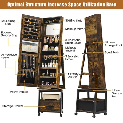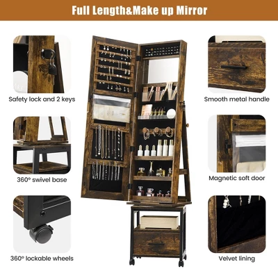 360° Swivel Jewelry Cabinet, 66” Freestanding Jewelry Armoire With Bottom Drawer, Lockable Full-Length Mirror With Rear Storage Shelves, Jewelry Armoire Organizer, Retro Brown