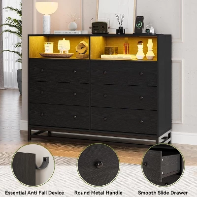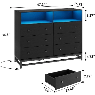 6-Drawer Wide Dresser with Built-In Charging Station and LED Lighting, Modern Black Wooden Storage Chest for Bedroom, Large Capacity Organizer