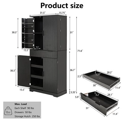 Specifications:Product DimensionOverall: 31.5″ x 15.75″ x 71.65″HDrawer: 28.1″ x 11.4″ x 3.2″Keyboard Drawer: 28.2″ x 11.4″ x  1.57″Product Weight: 118.14 LBSPackage Dimension: 42.13″ x 18.9″ x 11.02″Package Weight: 126.5 LBSMax. Weight CapacityEach Shelf: 90LBSDrawer: 50LBSNumber of Package: 1Installation Precautions:Tips 1: It is best to lay cardboard on the ground before installation to avoid staining or scratching the product.Tips 2: Try to avoid friction between wooden boards during installation, otherwise it may cause scratches that are difficult to remove.Tips 3: Do not tighten the screws too early.