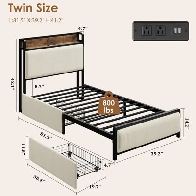 - 【Twin Size Bed Frame with 2 Storage Drawers】This bed frame twin comes with 2 spacious storage drawers with smooth wheels, perfect for storing clothes or bedding. The screw lock prevents the drawers from sliding out. Additionally, the extra 10.6-inch space under the bed can be used to store shoes, boxes, or suitcases, making the most of the under bed space.