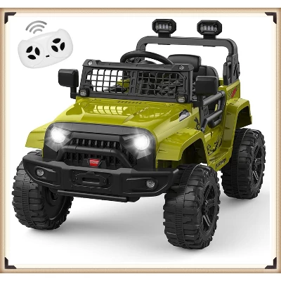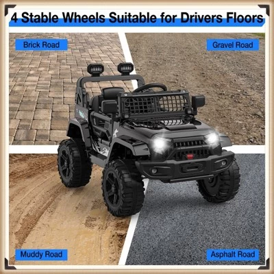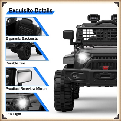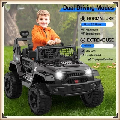 Let your little driver explore in style with this 12V battery-powered ride-on truck! Designed for kids ages 2-5, this rugged off-road vehicle features dual driving modes¡ªremote control for parents and self-driving for independent fun. Built with a spring suspension, puncture-proof tires, and a safety cage chassis, it¡¯s ready for any terrain. Bright LED lights, built-in music, and phone connectivity turn every ride into a mini adventure. Compact in size, perfect for both indoor and outdoor play. A thrilling gift for birthdays or holidays!