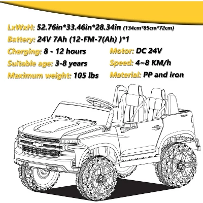 - An exciting 2-seater battery-powered ride-on truck designed for endless fun! This vehicle boasts two robust 120W motors and a 24V 7AH rechargeable battery, ensuring powerful performance and an extended driving range. With a top speed of 5 miles per hour, it can conquer various terrains, providing your child with an exhilarating driving experience.
