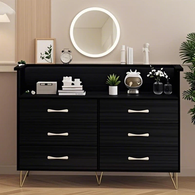Style meets smart storage with the Garvee 6 Drawer Dresser in soft pink. Designed for today¡¯s tech-savvy home, this dresser features a built-in charging station with 3 AC outlets and 2 USB ports¡ªperfect for powering up your essentials. Add ambiance with dynamic RGB LED lighting that changes color and syncs to music through an app. With 6 roomy drawers and an open shelf, it offers generous storage for clothes, books, or decor. Crafted from durable MDF with sleek metal legs and smooth-glide drawers, this piece brings functionality, elegance, and a pop of personality to any space.