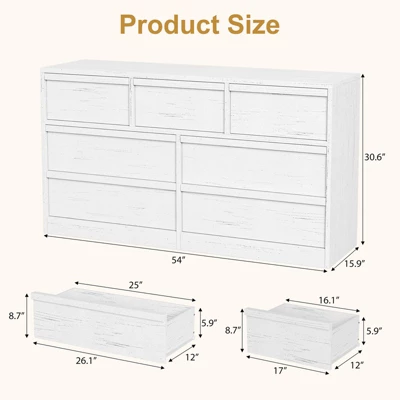 - VERSATILE DRESSER – The dimension of our 7 drawer dresser is 54″W x 15.9″D x 30.6″H, which makes it can not only be used as dresser organizer in bedroom, but also as sideboard buffet table in dining room, as tv stand or entertainment center in living room. It also fits perfectly into the nursery, entryway to meets your storage needs