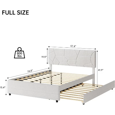 This stylish Bed with Twin Trundle combines modern design with practical functionality. The upholstered headboard adds elegance while the easy-glide trundle provides extra sleeping space when needed ¨C perfect for guests, kids, or small spaces! ? Space-Saving Trundle ¨C Twin pull-out bed with smooth rolling casters ? Upholstered Headboard ¨C Plush padded backrest for comfort & style ? Sturdy Wood Slats ¨C Supports both beds (no box spring needed) ? 500 lb Weight Capacity ¨C Durable MDF & particleboard construction ? Multi-Room Use ¨C Fits bedrooms, living rooms, or home offices