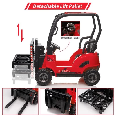 - 12V Electric Forklift Realistic Design: Featuring a liftable fork and removable pallet, this 12V electric forklift allows children to control the arm fork movement through the right control stick. Child will feel like a real forklift operator.Give your child a realistic driving experience with Electric Ride-On Forklift.