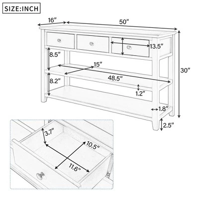 Specification:Material: Pine Wood Frame with MDF TabletopDimensions: 50″W x 16″D x 30″HMax Load Capacity:Tabletop: 220lbDrawer: 17lb eachOpen Shelf: 66lb
