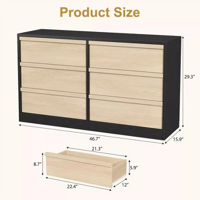 This is a modern wooden dresser featuring a clean, minimalist design with a natural wood finish. It stands 29.3 inches tall, 46.7 inches wide, and 15.9 inches deep, providing ample storage space. The dresser has six drawers, each with a smooth-gliding mechanism for easy access. The drawer is measuring 22.4 inches wide and 8.7 inches deep. The dresser is equipped with an anti-tipping device to ensure safety, especially for homes with children and pets. It also has a spacious tabletop for displaying decorative items or daily essentials. The dresser’s construction is safety-tested, and it’s designed to blend seamlessly with various interior styles.