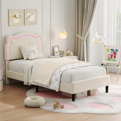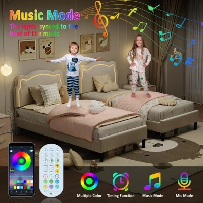 - Multi-Function RGB LED Bed: This upholstered bed frame is equipped with smart LED light strips that offer over 16 million colors and more than 20 lighting effects, including brightness, flashing, and wave patterns. It also features multiple modes such as music, microphone, and timer, allowing you to create your ideal bedroom ambiance. You can adjust the colors, brightness, and modes through a mobile app or remote control, which not only creates an enchanting atmosphere in your bedroom but also serves as a night light.