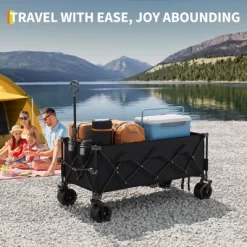 Compact & Collapsible Wagon: No assembly required. Its innovative design allows for quick and simple setup and folding in seconds. With a handle on the cover, you can move it smoothly and take it anywhere easily. Folded dimensions (L x W x H): 9 x 13 x 26.8 inches. It fits perfectly in a closet, garage, or the trunk of any standard car, taking up minimal spaceLocking Brake Design with All-Terrain Wheels: Equipped with 4 large wheels, this all terrain beach wagon glides smoothly and is easy to transport on sand, gravel, grass, or virtually any surface. The two 360° rotating front wheels feature brakes, which effectively stop and prevent the wagon from movingBuilt to Last: This large beach wagon features a strong steel frame and 600D Oxford fabric, ensuring an extra-high weight capacity of up to 350 lbs. Meanwhile, the thickened Oxford fabric provides maximum tear resistanceUtility Beach Wagon: It is designed with two integrated water bottle pockets on the front, deep enough to hold your water bottles or other small items. The flexible telescoping handle with a rebound function keeps it upright, allowing you to control the wagon and navigate terrain with ease. Wagons for sports simplifies transporting essential items for events, outdoor outings, around the house, and moreUpgraded: Deeper and Larger Storage Capacity. Originsure folding cart unfolded dimensions: 54″ x 28.7″ x 42″; folded dimensions: 9″ x 13″ x 26.8″; wheel size: 7″ x 4″; handle height from the ground: 51.5″. Includes 1 side pocket, 2 mesh cup holders, 1 storage cover, and 1 strap