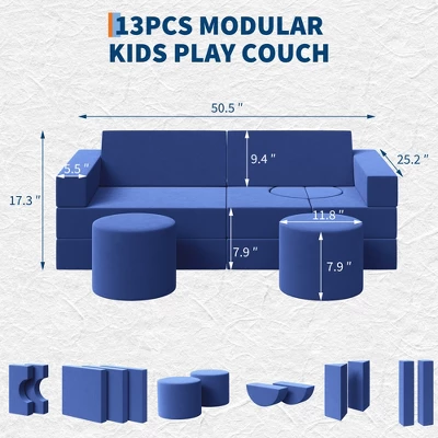 Garvee 13-Piece Modular Kids Play Couch Sofa for PlayroomStep into a world of imagination with the Garvee Modular Kids Play Couch, where each of the 13 pieces can transform into a cozy castle, a zippy race car, a magical spaceship, or a comfy reading nook—turning every playtime into an unforgettable adventure just waiting to be explored!Highlights at a Glance:- Multiple Configurations: Supports over 1000 imaginative play setups, including rocket ships, forts, and tunnels.- Unmatched Comfort: Soft velvet cover and premium sponge padding for hours of comfortable play.- Fast Recovery: Quickly regains shape after compression for a cozy play area.- Easy to Clean: Removable, machine-washable cover for simple cleaning and long-lasting use.- Ideal Gift: Perfect for birthdays, holidays, and baby showers, inspiring creativity in kids.Specifications:Product Size: 50.39 x 25.20 x 19.29 inchesQuantity: 13 pcsMaterial: Velvet + SpongeCertification: CPSC, CPC, CPSP, CertiPUR-US, OEKO-TEPacking List:1 x Modular Kids Couch SetFriendly Note:1. Unpacking Instructions: After opening the vacuum bag, allow 24 hours for the couch to fully expand and regain its original shape for the best comfort and support.2. Washable Cover Care: When removing the plush velour cover, machine wash it in cold water and tumble dry on low to prevent shrinking and fading.