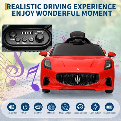 - Realistic Driving Experience – The ride maserati car for kids restores the appearance of a real car, equipped with 12V high-quality UL-certified motor power unit that provides stable current output on various terrains, as well as free control of high and low speeds (2-4.5Km/h).