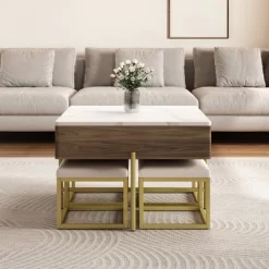 Specification: Product Size: 31.5″L x 31.5″Wx 20.9″H  Shape: Square  Top Color: White  Base Color: Gold  Top Material: MDF  Base Material: Metal  Weight Capacity: 110lbs  Assembly Required: Yes  Built-in Storage: The coffee table offers spacious hidden storage beneath the lift-top, perfect for stashing books, remotes, or everyday essentials. The ottomans also provide additional storage, keeping your living room neat and clutter-free.
