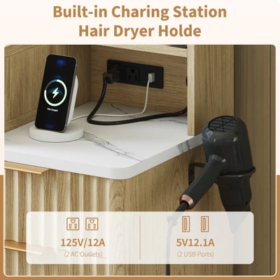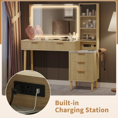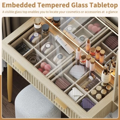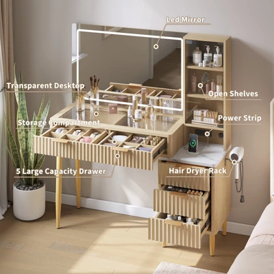Elevate Your Beauty Routine: This modern vanity desk combines elegance and functionality, crafted from natural oak with a sleek glass top. Featuring built-in LED lighting (adjustable brightness) and a 36-inch HD mirror, it ensures precision for flawless application. Five spacious drawers and adjustable shelves offer ample storage, while the timeless design enhances any décor. Perfect for clutter-free organization and daily glamour, it’s the ultimate upgrade for a luxurious, efficient beauty ritual.