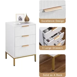 This 3-drawer nightstand measures 13.8″D x 15.8″W x 25.6″H.The bedside table with drawers is made of high-quality MDF board, combined with a gold-tone metal base to ensure durability and stability for long-term use, and the non-slip rubber pads on the bottom prevent the floor from being scratched and reduce noise when moving. This wooden end table with 3 drawers can store books, glasses, medicine or personal essentials, helping to keep the room tidy and organized. The wide top is perfect for displaying table lamps, clocks, potted plants or picture frames, and the unique striped design makes the best dresser for friends and family.