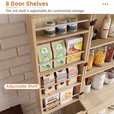 - Ample Storage Area: Featuring 2 large cabinets, a big slide-out drawer, 6 shelves (4 adjustable), and 8 door shelves, this kitchen pantry cabinet ensures you have enough space for all your food items, dinnerware, and small kitchen appliances, keeping everything organized and within reach
