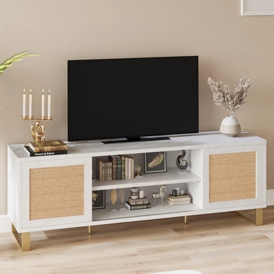 - MARBLE PATTERN TV STAND – Our TV stand perfectly combines the marble pattern with handmade rattan door, the golden legs make the whole furniture more gorgeous, which can be easily integrated into your house.