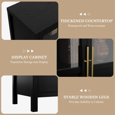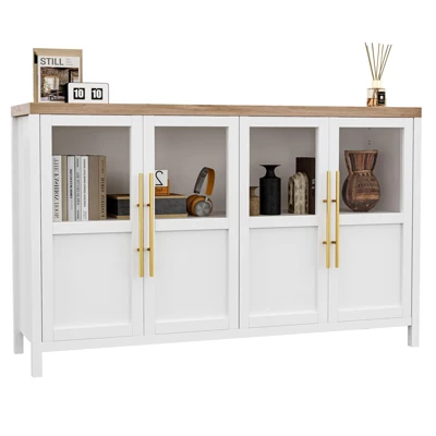 - [Elegant Glass Display & Concealed Storage] Showcase your dinnerware, glassware, or favorite decor with the elegant glass doors of this buffet sideboard, bringing openness and a refined look to any room. The contrasting wood-panel doors add privacy for less-used items, ensuring your space remains organized and clutter-free while delivering a harmonious blend of display and hidden storage.