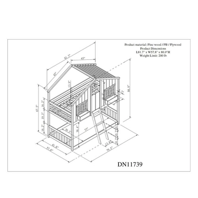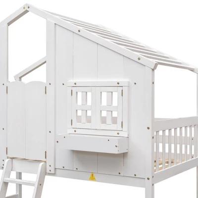 Wood House Roof bunk Bed: The unique design of wood house bunk bed with windows,door,ladder,provides kids with endless imagination and access to the natural wood, while they go to bed and fall asleep.Kids Playing Area: This bed not only gives them a lot of fun, but also add to their imagination and creation. They can put various decorations and accessories on the window boxes to accompany their whole sleep and daily activities.Low Height Design: The low height feature of this bunk bed not only ensures better stability but also reduce safety concerns, offering many restful nights of lasting sleep. In addition, the ladder is designed spacious steps.Safety and Quality Guaranteed: This bunk bed is mainly crafted from premium pine wood, its bottom frame structure providing lasting sturdiness and durability.Secured Structure: The bunk bed is constructed with firmly secured structure, forging strong stability that ensures the safety of users while resting in the loft bed. The high guard rails surrounding the bed will further protect users.