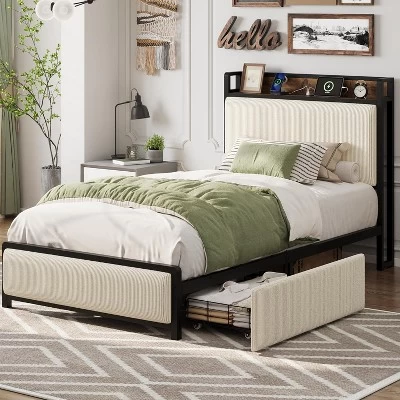 Maximize space & convenience with this Twin Size Bed Frame, featuring 2 spacious storage drawers and a built-in charging station (2 USB ports + 1 Type-C). The velvet-upholstered headboard adds rustic elegance while providing cozy back support for reading or relaxing.