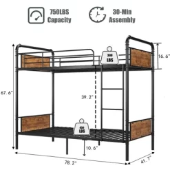 Combining a sturdy metal frame with vintage wood accents, this bed exudes a minimalist and industrial charm that effortlessly complements any interior decor style.Moreover, Easily transform this bunk bed into two separate twin beds, ideal for maximizing space in kids’ rooms, guest rooms, or dormitories.