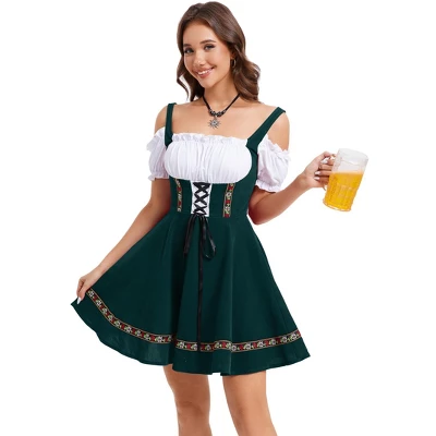The womens dress features square neck, short sleeve, premium velvet embroidery dress with delicate lace up detailing on the front for adjustable bust sizing and a charming apron.