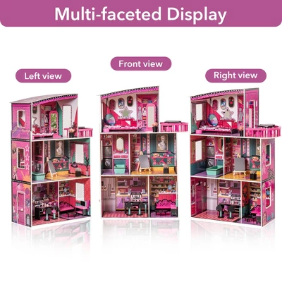 Product DescriptionThis 3-story dollhouse, made from high-quality CPC-certified MDF, offers a safe and fun play experience for kids. Featuring 5 rooms—including a kitchen, living room, bathroom, art studio, and bedroom—plus a balcony, it’s perfect for imaginative play. The realistic design includes an opening and closing door and a mirror where dolls can be seen clearly. Ideal for two children, it helps develop hands-on and social skills. Suitable for dolls under 13 inches (dolls not included), this dollhouse measures 29.64 x 11.7 x 42.9 inches and provides endless fun and entertainment!Product Information